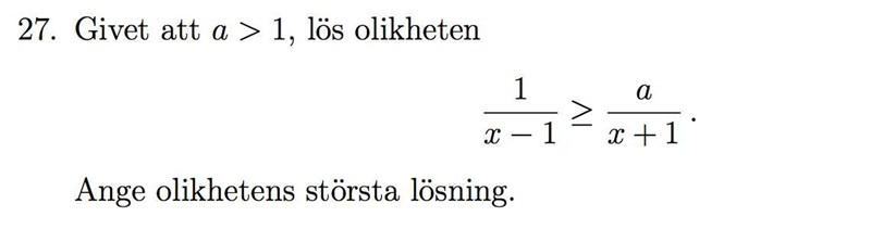 Jag tänkte lösa olikheten genom att hitta nollställen för ekvationen. Sedan göra en teckentabell för att hitta det största värdet för x. Däremot så har jag svårt att hitta nollställen för ekvationen eftersom jag har två okända tal, a och x.