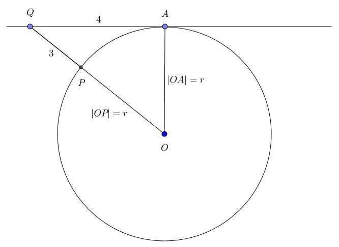För en bättre visuallisering på problemet. Här kan du se att hypotenusan är |OQ|=r+3 och kateterna är 4 respektive r. Pythagoras sats ger