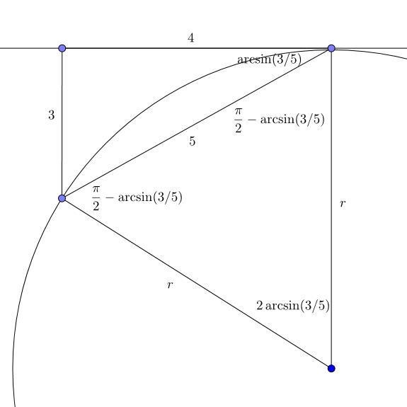 Dessa punkter tillsammans ritar ut en triangel, och med längderna där ska du lista ut radien på cirkeln.