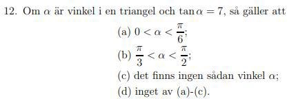 Ett snabbt sätt att rita en vinkel med tangens 7 är att ta ett rutat papper och rita en rätvinklig triangel där det ena kateten är 1 ruta lång och den andra är 7 rutor lång (tangens=motstående katet/närliggande katet). Då ser man nästan direkt att b måste vara rätt svar.