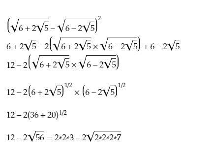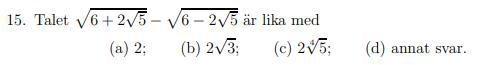 EDIT: Ser nu att jag har gjort fel i nästsista steget. Det ska stå 2(36-20)^1/2 vilket är roten ur 16 multiplicerat med 2. Då blir det 12-8, och sedan roten ur det, vilket är två som är rätt svar. Tack för hjälpen!