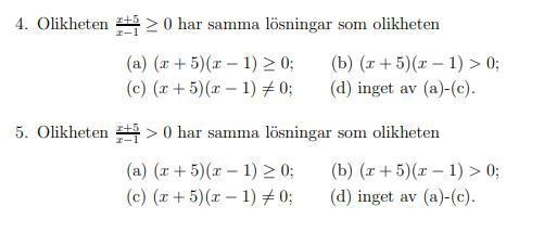 c) detta betyder att alla x värden som inte är -5 eller 1 bör fungera. Dock är det inte så eftersom exempelvis -3 inte ger att olikheten gäller så därför utesluts c)