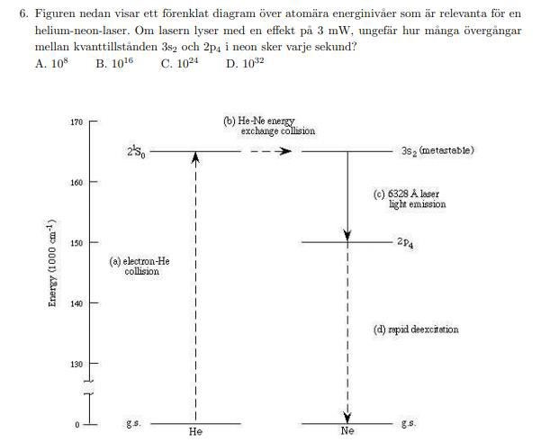 Sedan vet vi att E = hc/lambda, där h = 6.64*10^-34, c = 3*10^8 och lambda = 6.328*10^-7 m. Sätter du in dessa värden får du