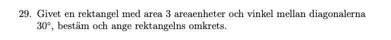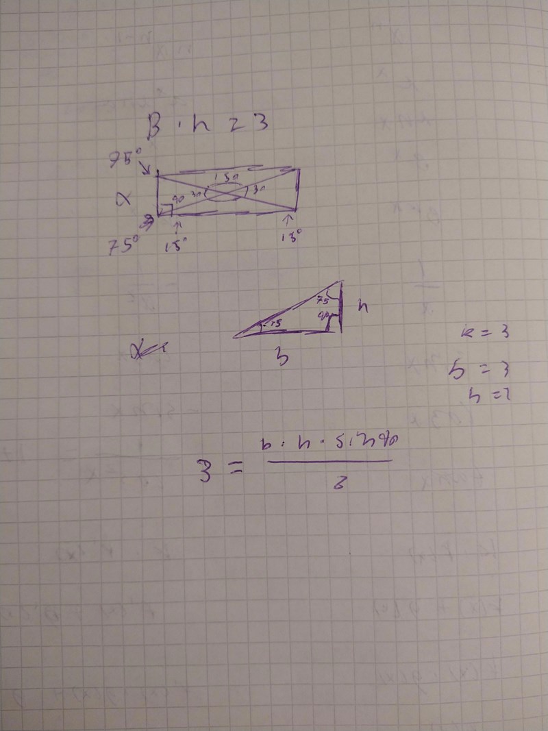 Jag kommer ingenstans, jag antog att omkretsen var 6 eftersom vid hörnet så är vinkeln 15 vilket innebär att basen måste vara 3 gånger höjden eller jag antar det då 45 grader skapar en diagonal strek så borde 15 skapa en med lutningen 1/3