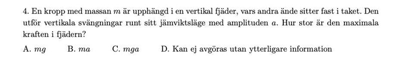 Det hade behövts fjäderkonstanten. Eller så hade man behövt veta svängningsperioden/-frekvensen. Eller information om största hastighet eller dylikt.