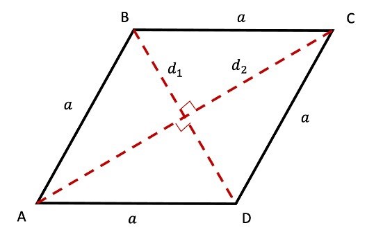 Parallellogramsatsen säger att d12+d22=4a2{d_1}^2+{d_2}^2=4a^2 för denna romb.