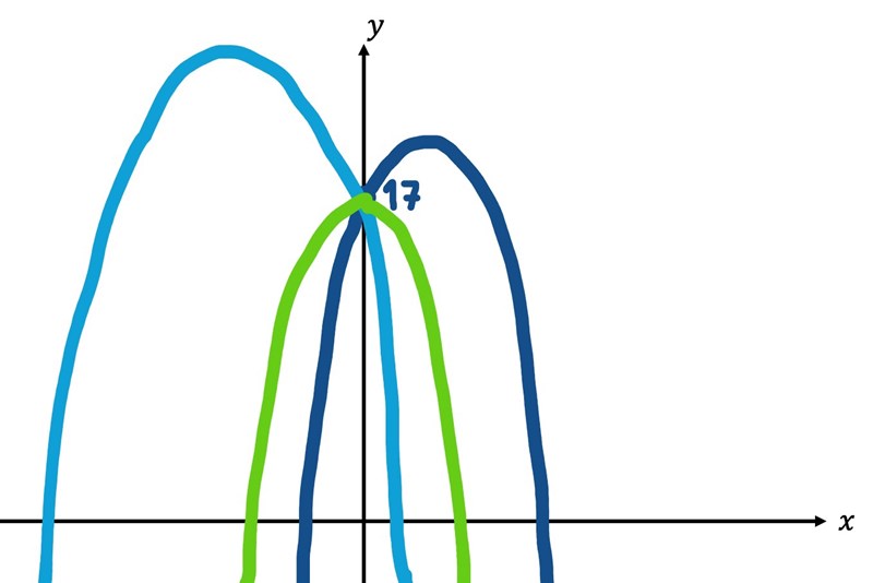 Det snabbaste sättet är troligtvis att rita upp ett koordinatsystem och markera ut 17 på y-axeln. Eftersom konstanttermen är 17, måste parabeln skära denna punkt oavsett värde på b. Med en negativ koefficient framför andragradstermen, måste funktionen ha en minimipunkt. Det begränsar kraftigt antalet möjliga parabler. Rita upp några av dem (ungefärligt):