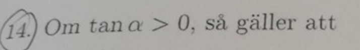 Här är det nog enklast att prova med några olika värden. Om , är tangens positivt, men sinusvärdet är också positivt. Då kan vi utesluta (b) direkt. Dessutom blir cosinusvärdet negativt, och vi kan utesluta (c).