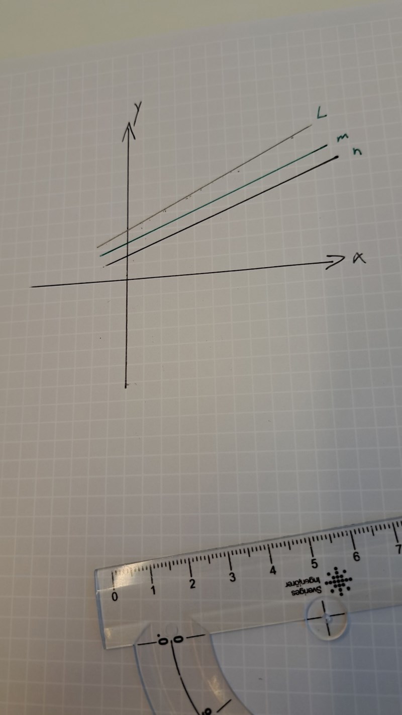 Ture skrev:Om du ritar upp alternativ a, med linjen n överappandes linjen l så faller det alternativet, om man anser att två överlappandes linjer inte är parallella.