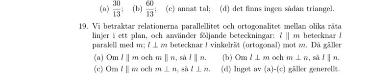 Jag svarar d) för att man kan ej säga svara med 3 alternativ när endast ett svar av dem är rätt. Hur menar du att en linje ej är parallell med sig själv och var står det i alternativen att någon av dem är parallell med sig själv?