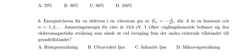 Pieter Kuiper skrev:Det är bara alternativ A (röntgenstrålning) som du kan stryka på grund av att det är givet att det handlar om väte.