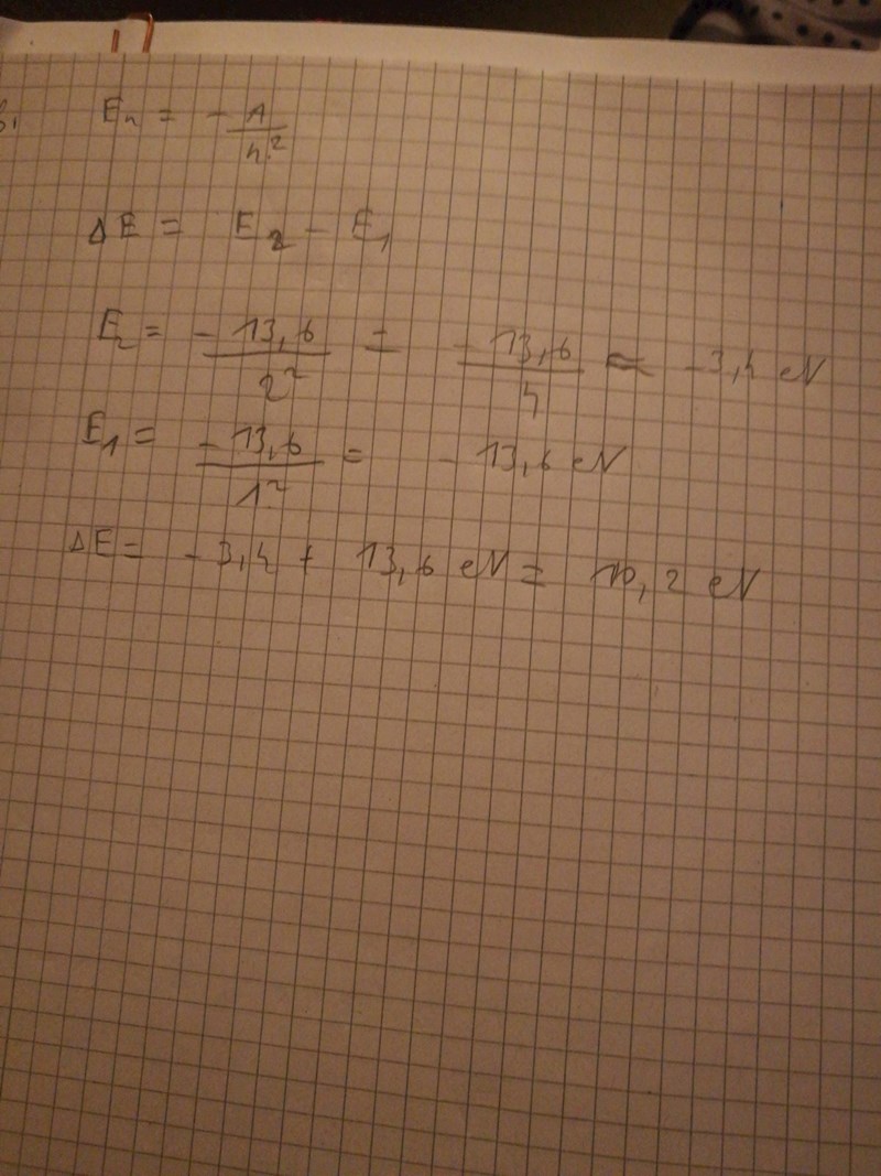D4NIEL skrev:En foton utsänds när väteatomen går från det andra exiterade tillståndet () till grundtillståndet (). Fotonen får därmed energin .