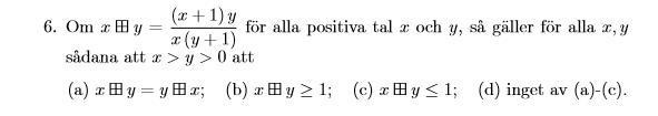 Om jag gör om uttrycket till xy + y/ xy + x och tänker att eftersom x > y > 0 måste nämnare vara större än täljaren och så uttrycket blir ett positivt bråk mindre än 1, vilket ger svaret (c). Är det så simpelt?