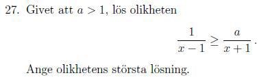 Ja, antingen är x > 1, mindre än (-1), eller (-1) < x < 1. Undersök dessa fall, och se vilken den största roten är. Det är hela lösningen.