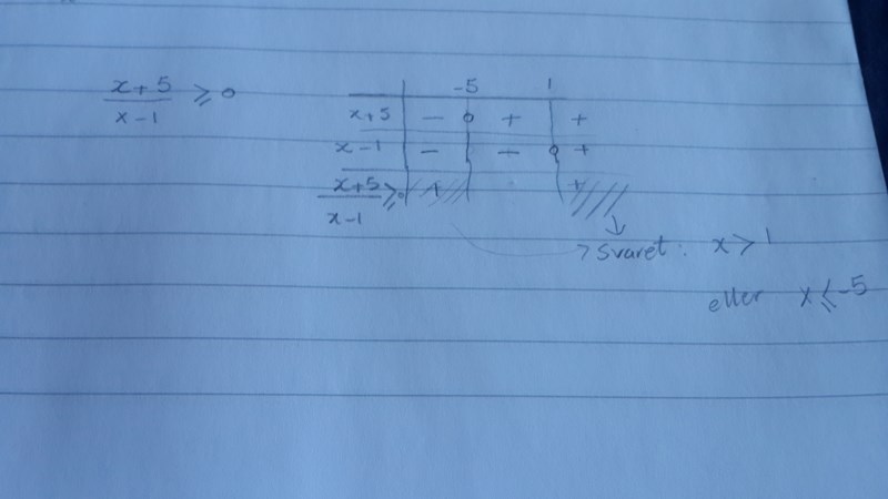 Antingen gäller att x + 5 > 0 och x - 1 > 0, dvs att x > 1 eller så gäller att x + 5 < 0 och x - 1 < 0, dvs att x < -5.