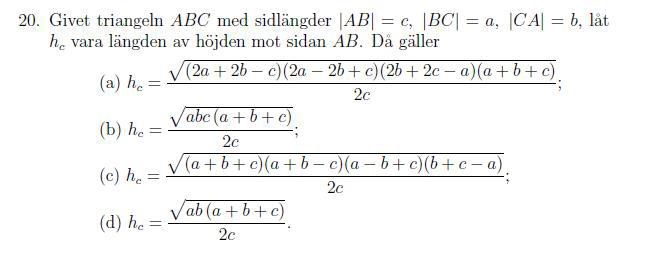 Om svaret gäller för alla trianglar måste det gälla även för rätvinkliga trianglar. En rätvinklig triangel där sidorna är små heltal är a=3, b=4, c=5.