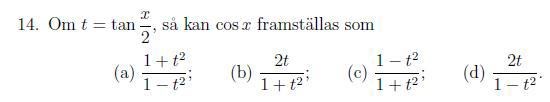 För att sedan välja vilket av de kvarvarande alternativen som är rätt kan du bara pröva med lite enkla värden på x och se vilket uttryck som ger rätt värden för cos(x). Tips: Börja med det allra enklaste enkla.