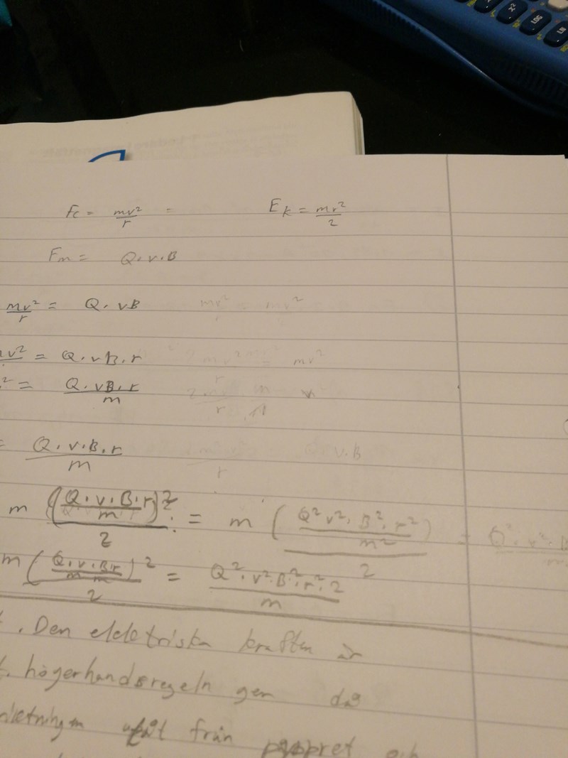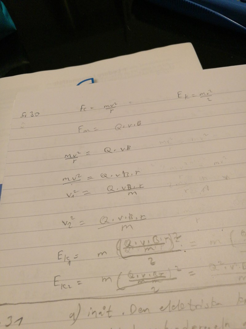 Jag vet ej hur jag ska komma vidare, har snurrat kring Ek1/Ek2 och jag känner till formerna Fc=mv^2/r samt Fm=qvB