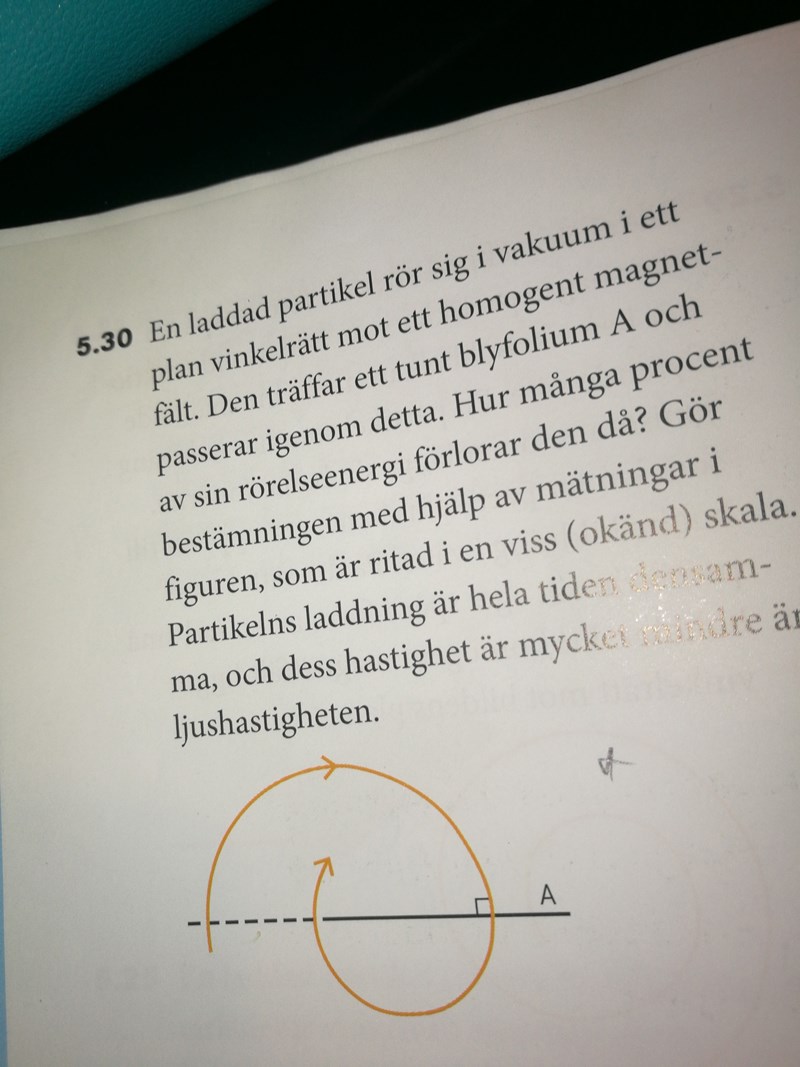 När du har gjort detta får du jämföra uttrycket för v innan och efter träffen. Kom ihåg att m,q och B är konstanta. Sedan kan du stoppa in detta i formeln för rörelseenergi och jämföra.