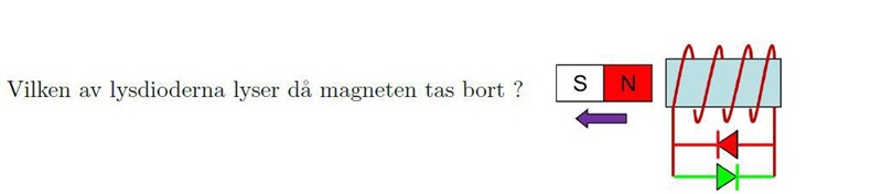 När man för in magneten i spolen så kommer magnetfältet i spolen att ändras. Det induceras en ström som skapar ett magnetfält som motverkar det magnetfält som införs i spolen. Jag tolkar detta så att om vi har magneten som på bilden, som förs in med sydpolen först så kommer strömmen att gå så att den röda lampan lyser.