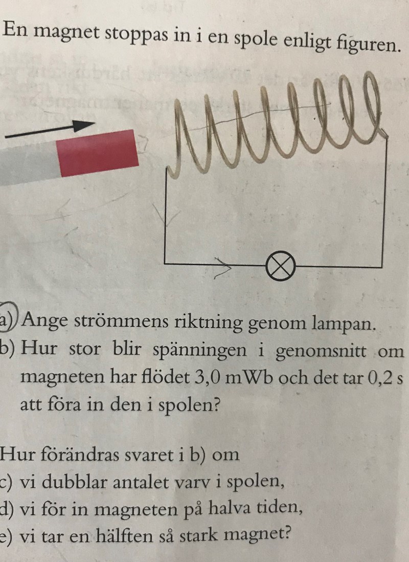 Hej, jag behöver hjälp med a). När magneten närmar sig spolen ökar magnetiska flödestätheten. Enligt Lenz lag kommer det då att uppstå en inducerad ström med riktning som motverka ökningen av magnetisk flödestäthet. Magneten har också ett magnetfält som går ut från nordänden till sydänden. Så långt har jag kommit men vet inte hur jag ska fortsätta.