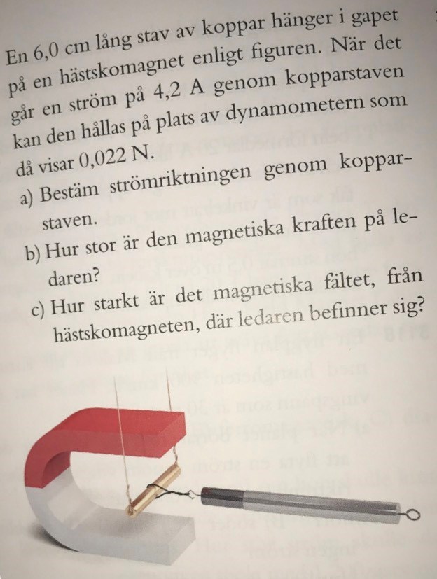 Det är ju strömriktningen man frågar efter i fråga a. Du vet ju att ledaren vill flytta sig åt vänster i bilden som Smutstvätt la upp (annars skulle det inte fungera att håll aemot med dynamometern).