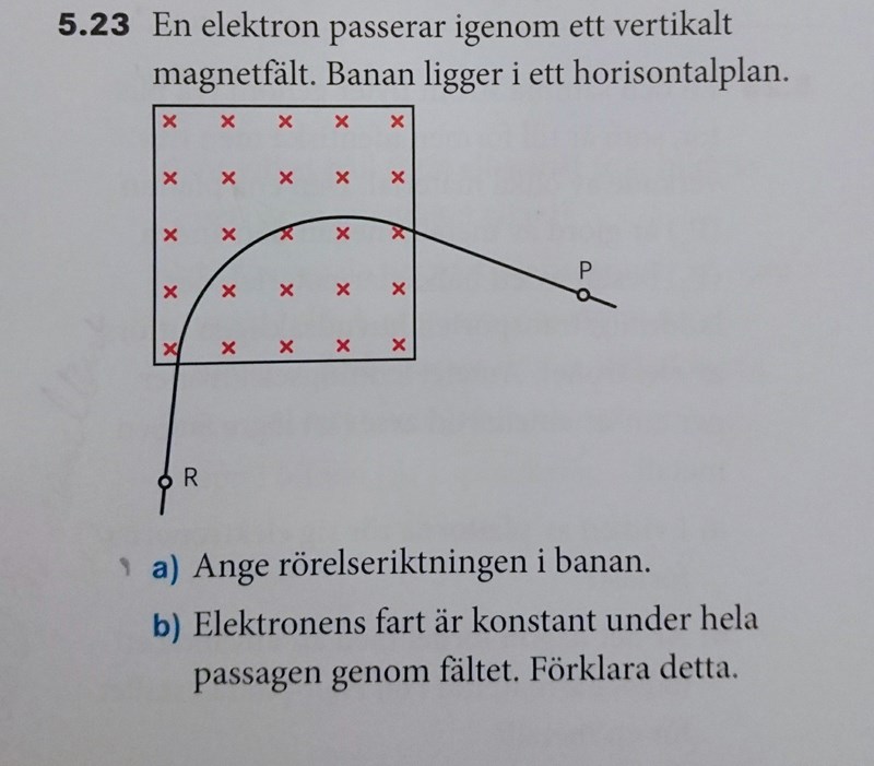 Teraeagle skrev :I b-uppgiften är det mycket riktigt så att centripetalaccelerationen bara påverkar elektronens hastighet (som har storlek och riktning), men inte dess fart (som bara har en storlek).
