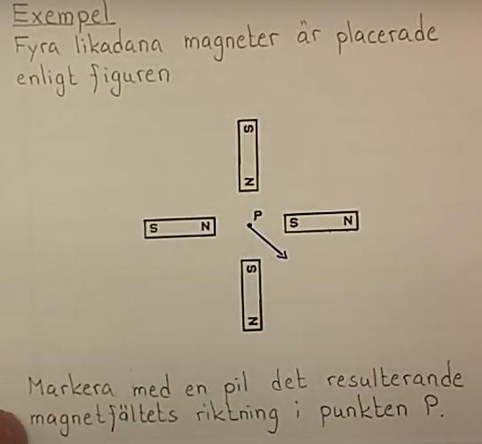 Kolla på hur varje magnet bidrar till fältet vid P. Tänk bort alla magneter utom t.ex. den översta och dra en pil från P åt det håll som magnetfältet från den magneten pekar. Sen tänker du bort alla magneter utom t.ex. den högra och gör samma sak. Och så vidare. Då har du 4 pilar som alla går från P åt något håll. Det totala magnetfältet vid P är då "summan" av de 4 pilarna. Med summa menar jag resultanten av dem.