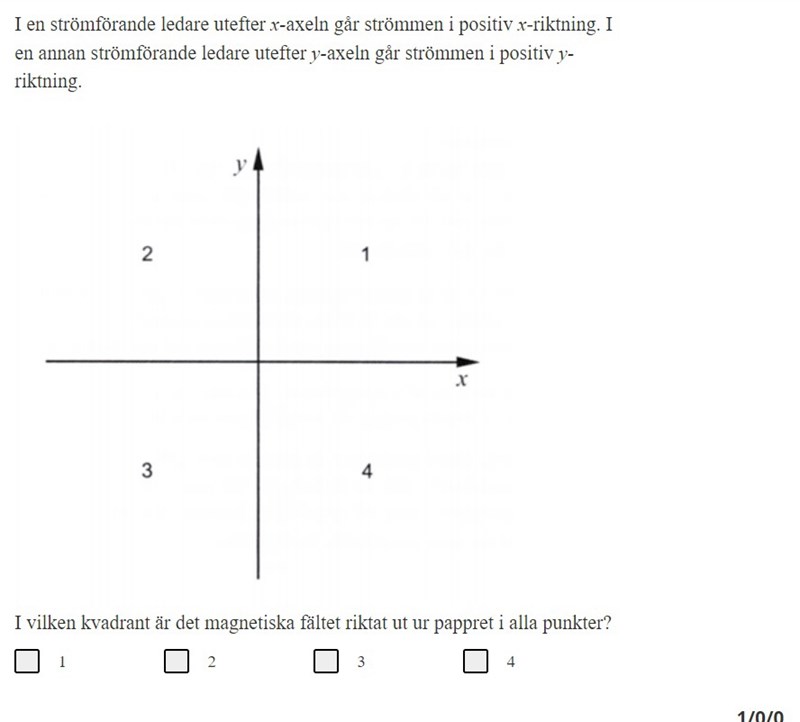 Det finns bara en kvadrant där både x-ledarens och y-ledarens magnetfält riktar ut ur pappret. (Och så riktar det resulterande magnetfältet säkert också ut ur pappret.)
