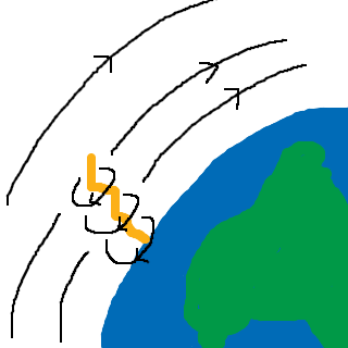 Ungefär såhär ser situationen ut. Blixten har sitt eget magnetfält, och jorden har sitt. Den horisontala komposanten är den som går längs med jordklotet.