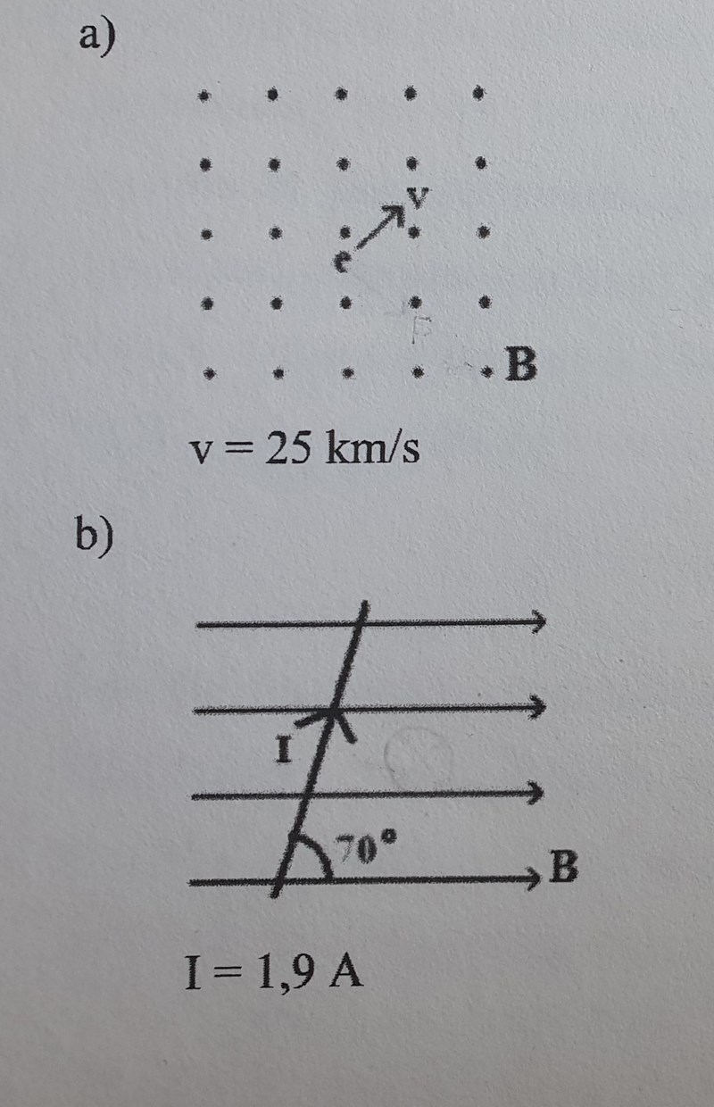 Uppgift: I samtliga fall nedan är den magnetiska flödestätheten 23 mT och ledarens längd i magnetfältet är 45 cm. Bestäm hur stor kraft som partiklen/ledaren nedan påverkas av och rita eller skriv med ord vilket håll denna kraft är riktad