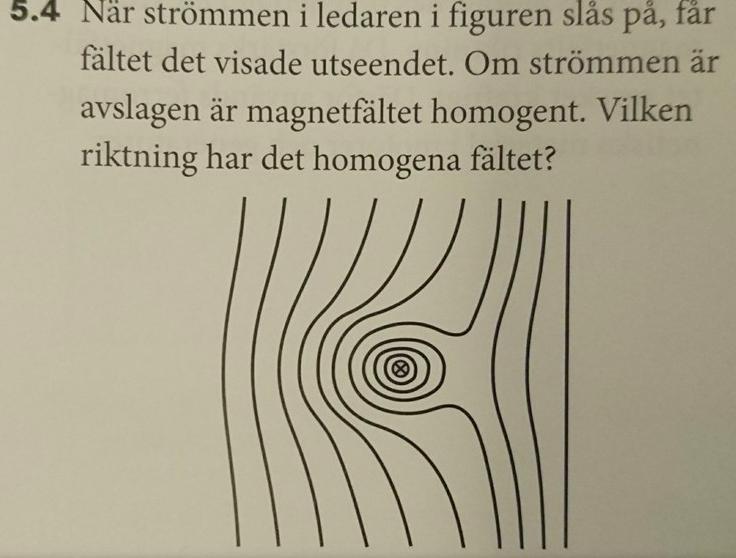 Jag förstår inte hur man ska lösa den här uppgiften. Först och främst står det i boken att magnetfältet kring en strömförande ledare består av koncentriska cirklar. Det ser man ju också i bilden ovan att fältet är cirkulärt nära ledaren, men längre ut i fältet så övergår cirklarna till att bli mer "raka" linjer. Varför är det så? Jag tänker att fältet fortfarande borde bestå av koncentriska cirklar längre ut, men att avståndet mellan dem ökar eftersom flödestätheten är mindre ju längre ut från ledaren som man befinner sig