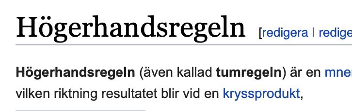 Smutstvätt skrev:Det finns två högerhandsregler – den ena använder tumme, pekfinger och långfinger, och visar sambandet mellan kraft, strömriktning och magnetfält. Men i detta fall har vi ingen särskild kraft, utan endast en ledare. Då bildas ett cirkulärt magnetfält runt ledaren, och för att veta om riktningen används en högerhandsregel med tummen längs strömmens riktning.