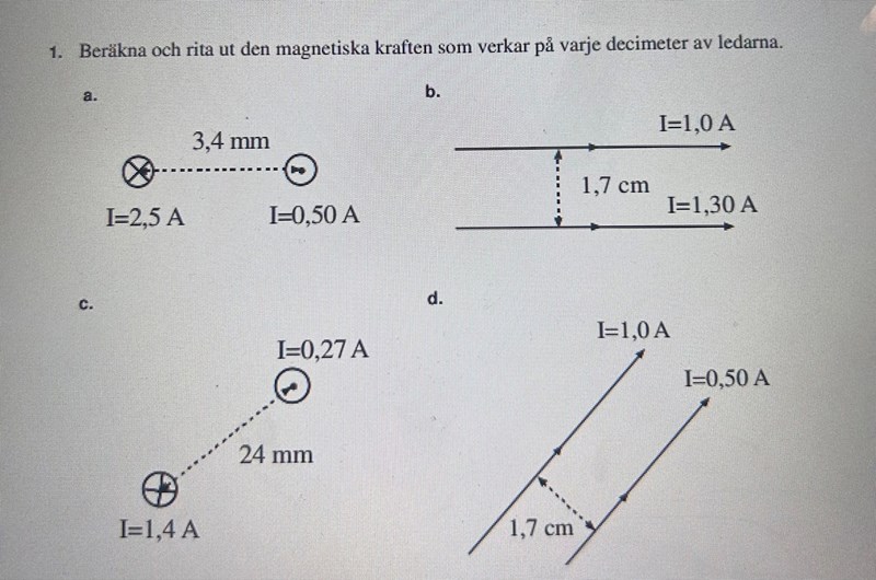 Först räknar jag magnetfältet genom B= 2.10^-7 * I / L, med två olika Komposanter B1 och B2, då det finns två olika ström, sedan ska jag tillämpa det i formeln för kraft dvs Fm= BIL men hur tänker man då. Ta fråga a som ett exempel, ska jag addera B1 och B2 eller subtrahera, ska jag addera I1 och I2. Behöver hjälp med hur man tänker.
