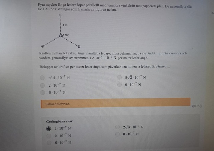 Jag förstår att man ska använda B=k gånger I/r för att veta B. Genom att sätta B=blir svaret bara .