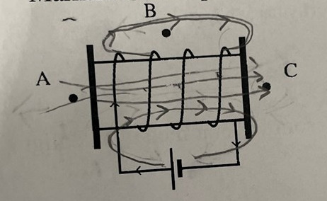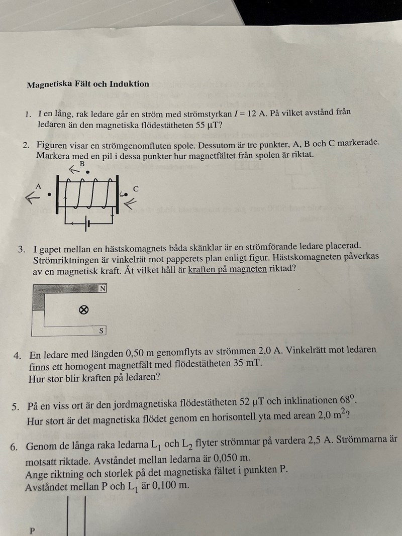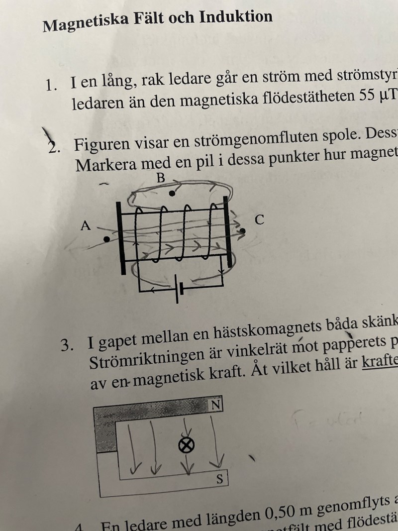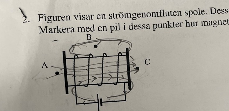 I uppgift 2 är väl magnetfältet riktat till vänster i alla 3 punkter enligt högerhandsregeln för en spole?Rita fältlinjerna.
