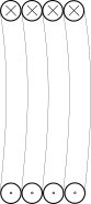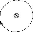 Krysset i ledaren betyder att strömmen går in i ledaren. Magnetfältet går i cirklar runt den.