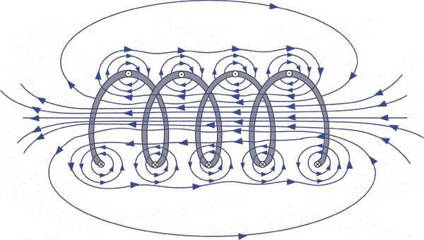 Runt ledarna i spolen är magnetfältet approximativt cirkulärt och deras superposition (samverkan och addition av bidrag) ger upphov till utseendet du ser i ovan bild till vänster. En kvalitativ illustration av superpositionen kan du se här: