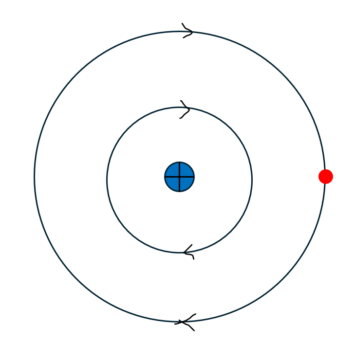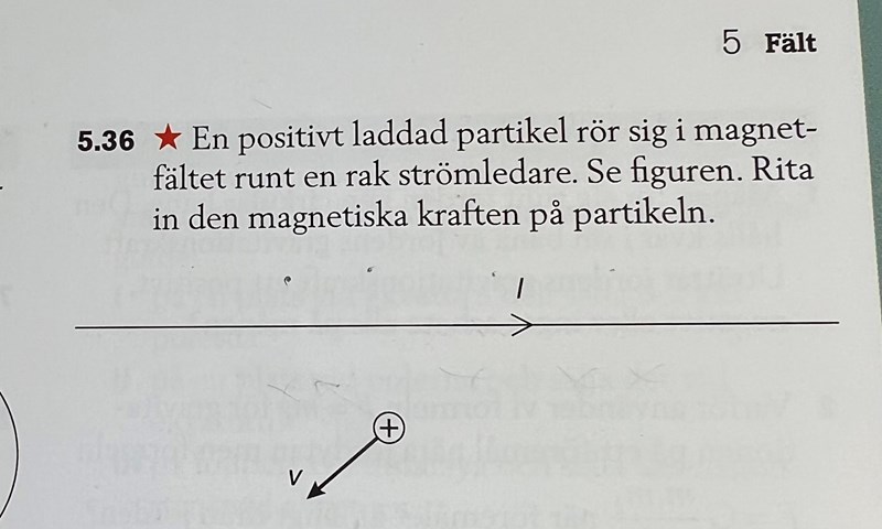 Såhär kan du kanske lättare förstå hur hur magnetfältlinjerna från strömledaren träffar elektronen. Jag har ritat ledare (blå) och elektron (röd) när man tittar från perspektivet "längs med" strömledaren.