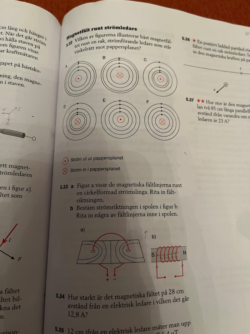 Jag vet att D stämmer eftersom den magnetiska fälstyrkan avtar när avståndet ökar. Men jag vet inte hur man kan läsa av detta i figurerna och varför det är D med ström som går in i pappret och inte C där ström går ut ur pappret.