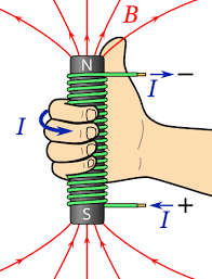 Det jag tycker är lättaste sättet att se åt vilket håll magnetfältet inuti spolen går, med högerhandsregeln. Gör som bilden visar,greppa spolen med fingrarna i strömriktningen, och titta åt vilket håll tummen pekar.
