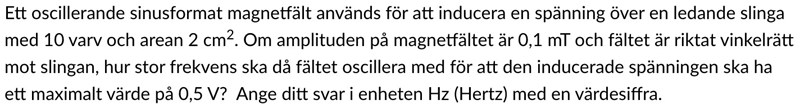 Den ledande slingan antar jag är en spole med 10 varv? Den magnetiska flödestätheten från magnetfältet är ju givet till 0,1 * 10^-3 T men hur får jag ens ut en frekvens? Vet inte heller hur jag ska ta hänsyn till att det är sinusformat