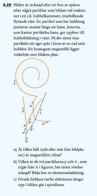 På bilden ser vi spår efter partiklar vars banor kröker åt såväl vänster som höger. Vi ser t.ex. att en elektron, som naturligtvis är negativt laddad, har vikt av åt vänster höger. Hur måste alltså kraften vara riktad på den partikeln? Hur ska magnetfältet vara riktat?
