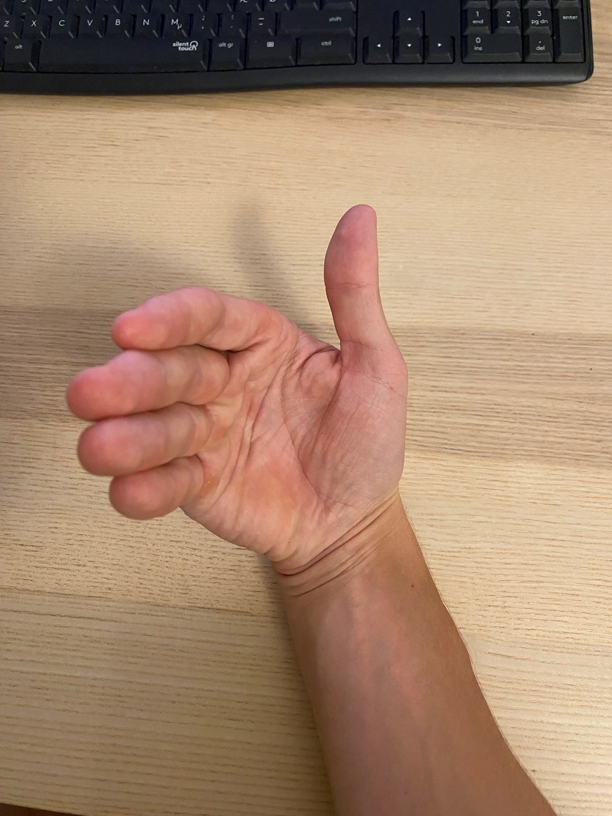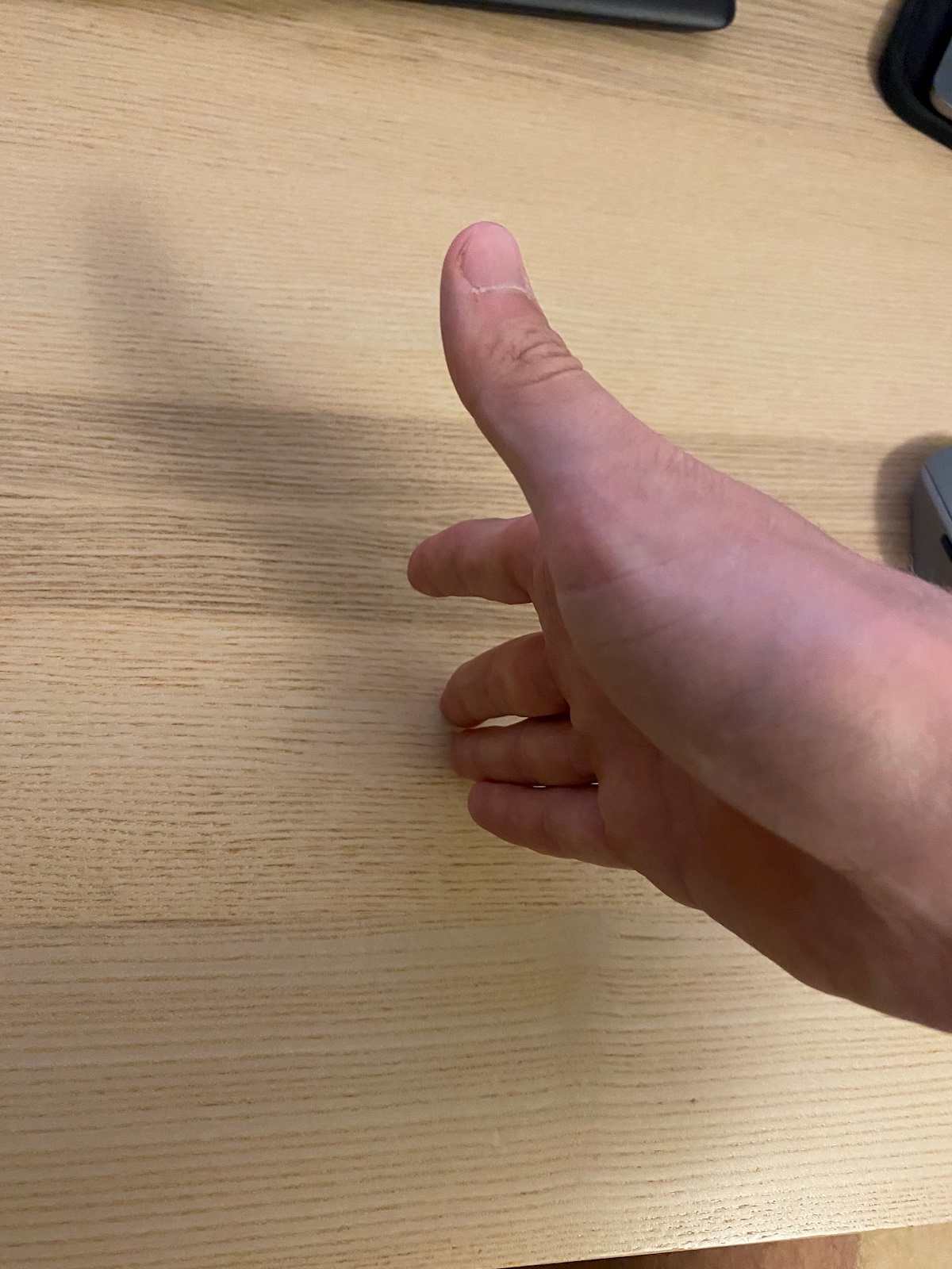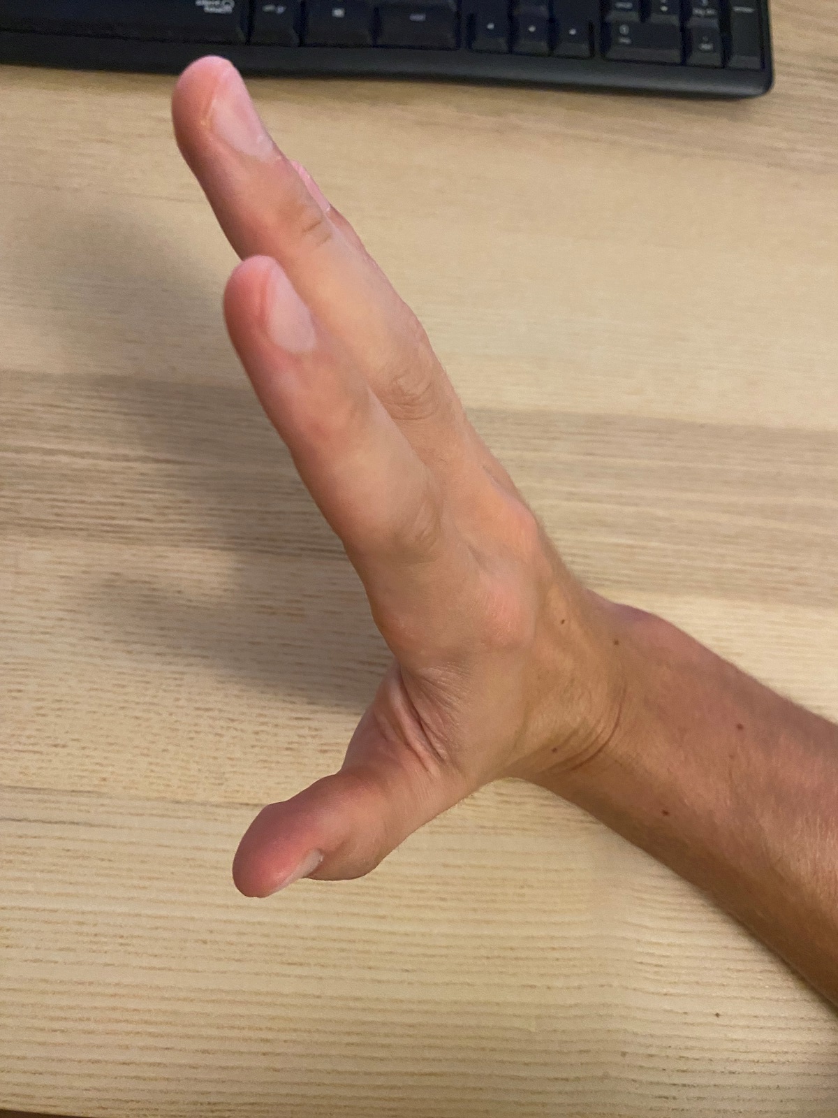 För att om du sätter din tumme neråt och din handflata åt höger så kan bara fingrarna peka inåt. Det finns inget annat sätt.