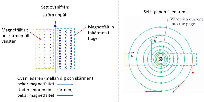 Till vänster: En ström i skärmens plan, här riktad uppåt. Till höger om ledaren går du magnetfältet in i skärmen och till vänster om ledaren kommer det ut ur skärmen. (lägg tummen på skärmen, fingrarna går in i skärmen till höger)