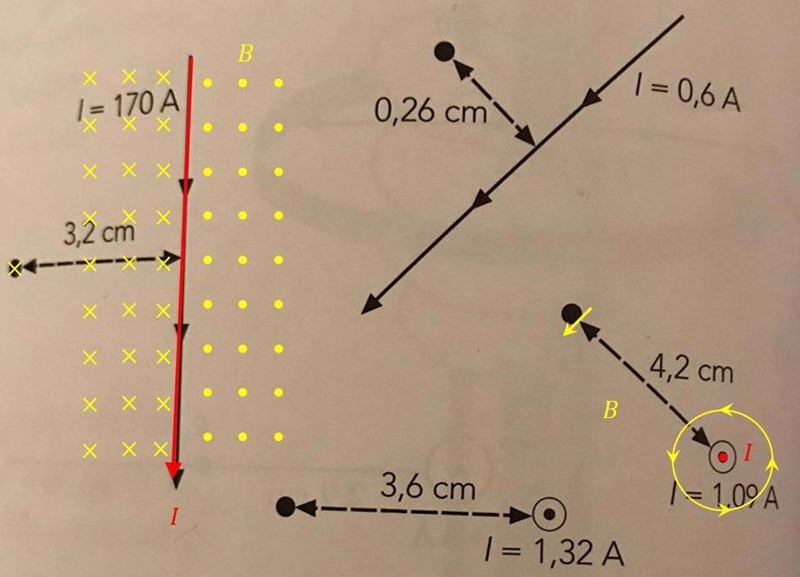 Har ritat ut riktning på ström (given i uppgiften) i rött och magnetfält i gult på två av uppgifterna. Håller du med eller är det oklart?