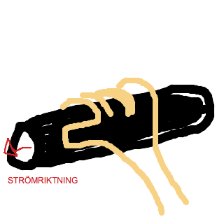 Vi kan börja med att titta på vad som händer när strömmen går bort från oss. Vi riktar pilen enligt med instruktionen (på bilden är pilen något lutad för att det ska bli lättare att se):