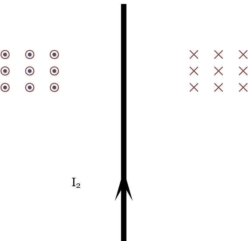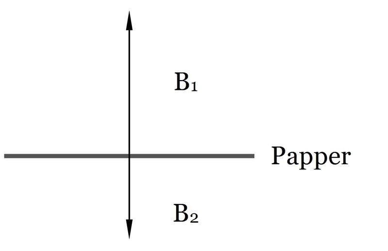 Eftersom den första ledaren genererar ett magnetfält som går rakt ut från pappret (mot dig) och den andra ledaren genererar ett magnetfält som går rakt in i pappret (från dig) kan man säga att vektorerna ser ut så här, vinkelrätt mot papprets plan: