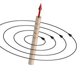 Magnetfältet runt en ledare bildar cirklar runt ledaren, så här (den röda pilen är strömriktningen)