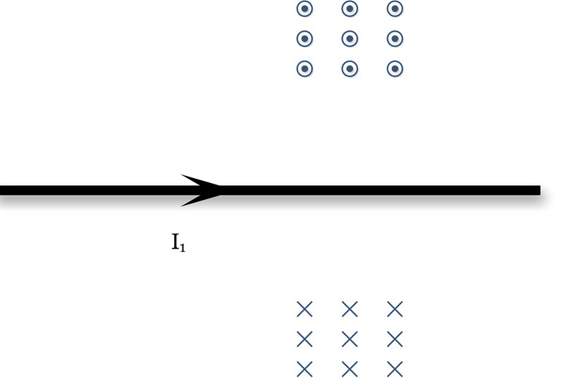 Till höger om ledaren går alltså magnetfältet in i pappret, till vänster om ledaren går magnetfältet ut mot oss från bilden.